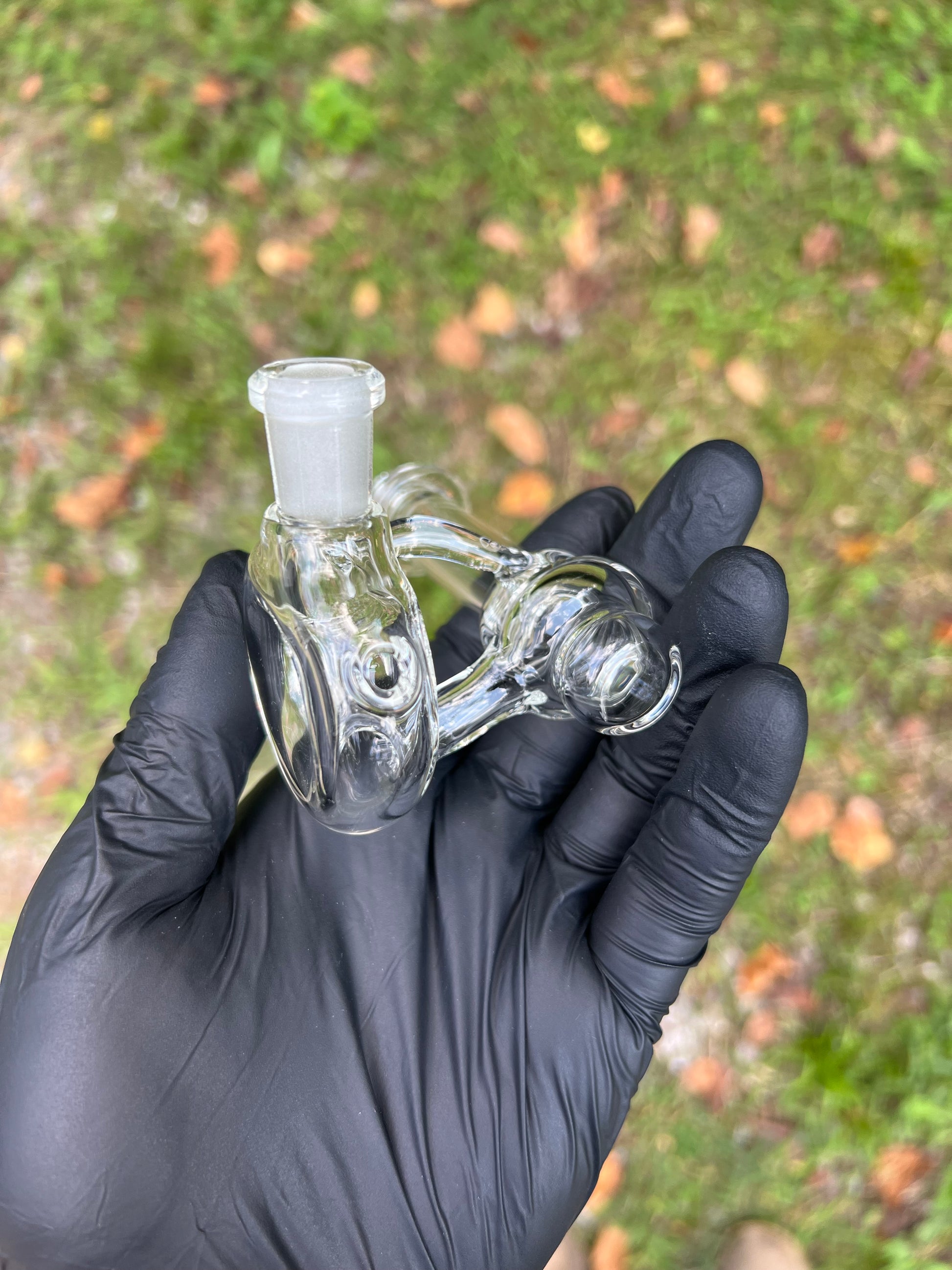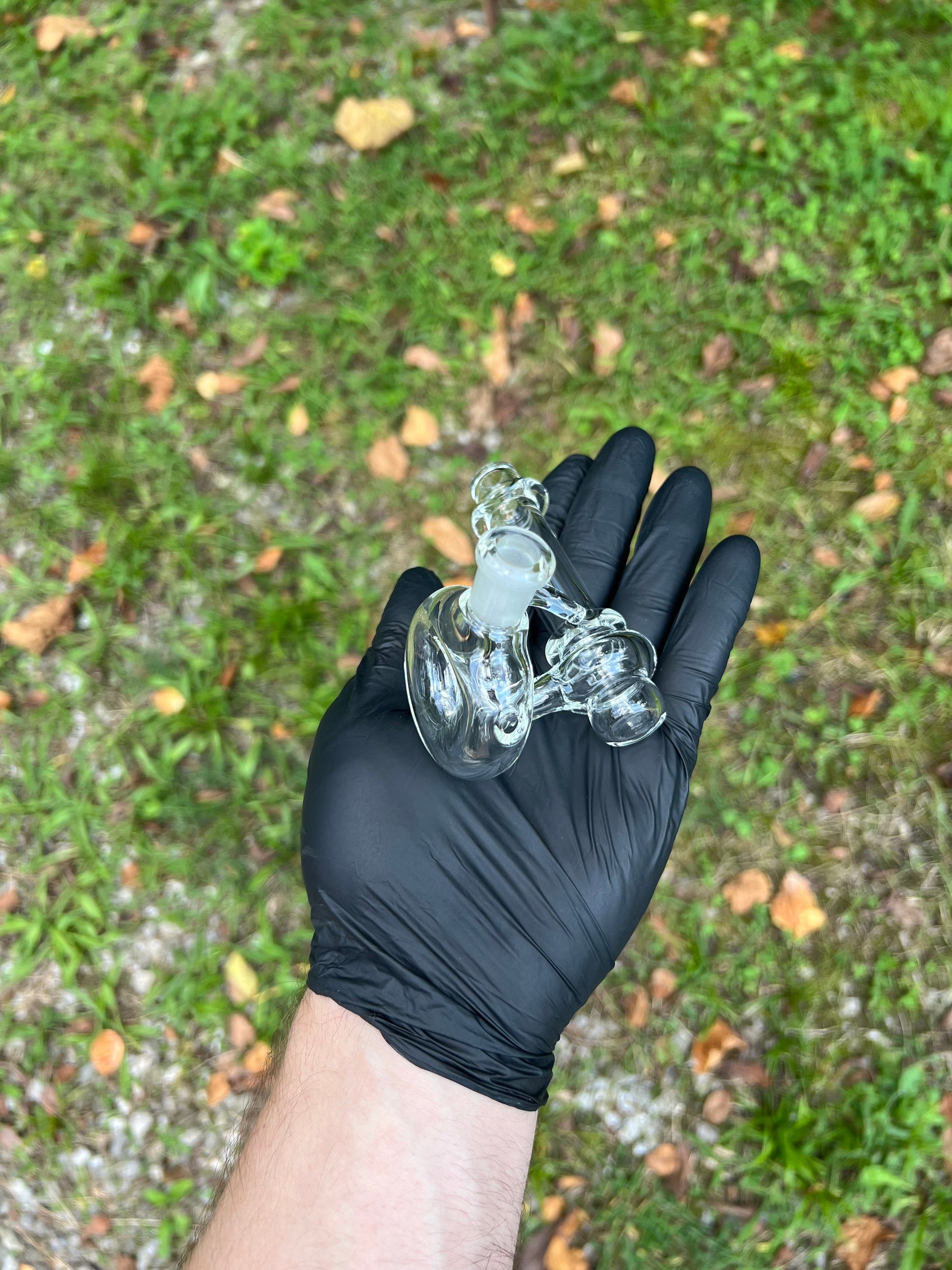 Dry Donut hammer/ sidecar style piece with a pre made 10mm joint at the end. Approximately 4 inch in length. This piece can sit upright on a flat surface and has a carb hole