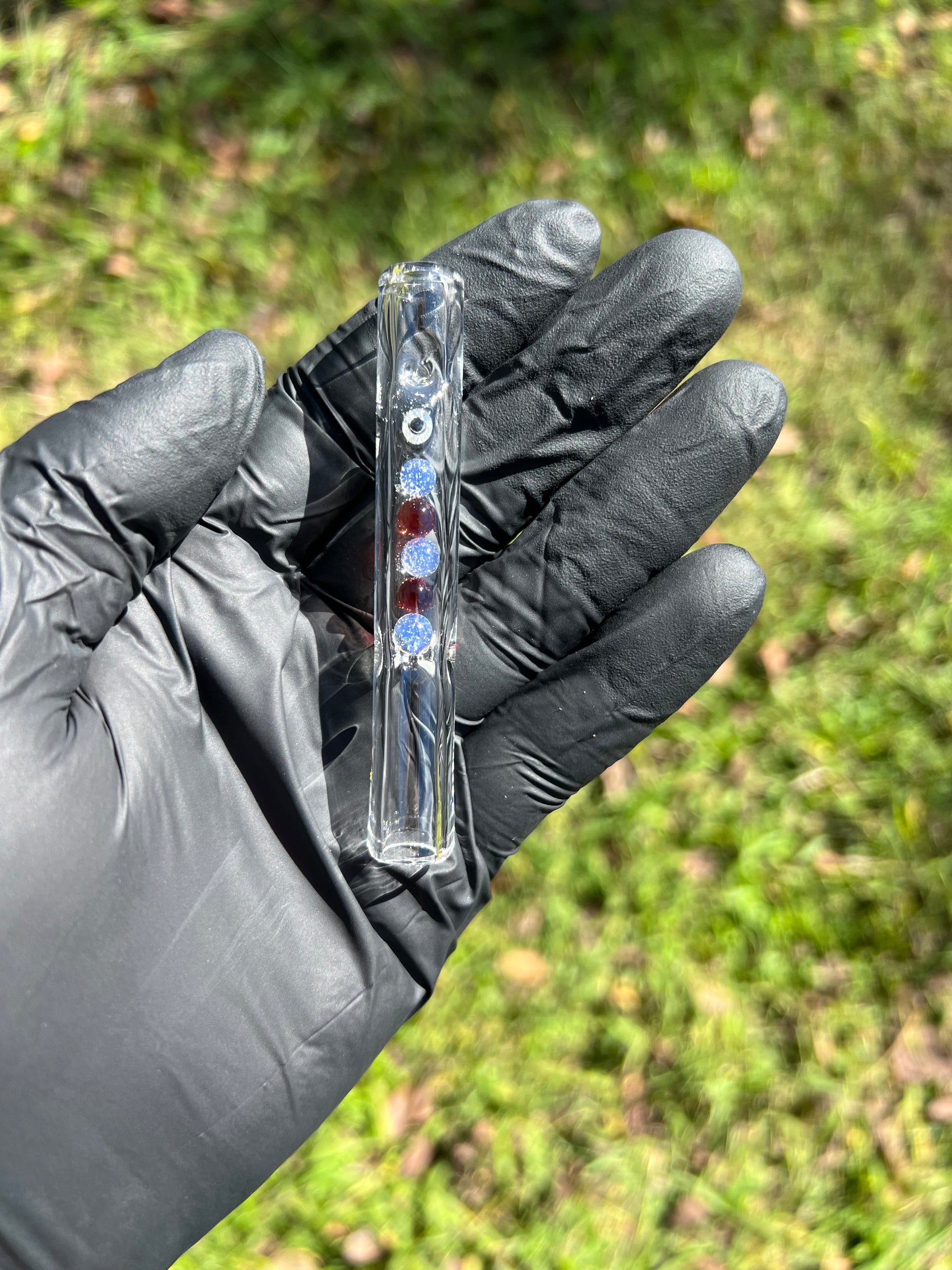Approximately 3.25 inch glass stem with Marbles for the firewood 10. This stem also works with various other 8mm devices like the dynavap and many more.